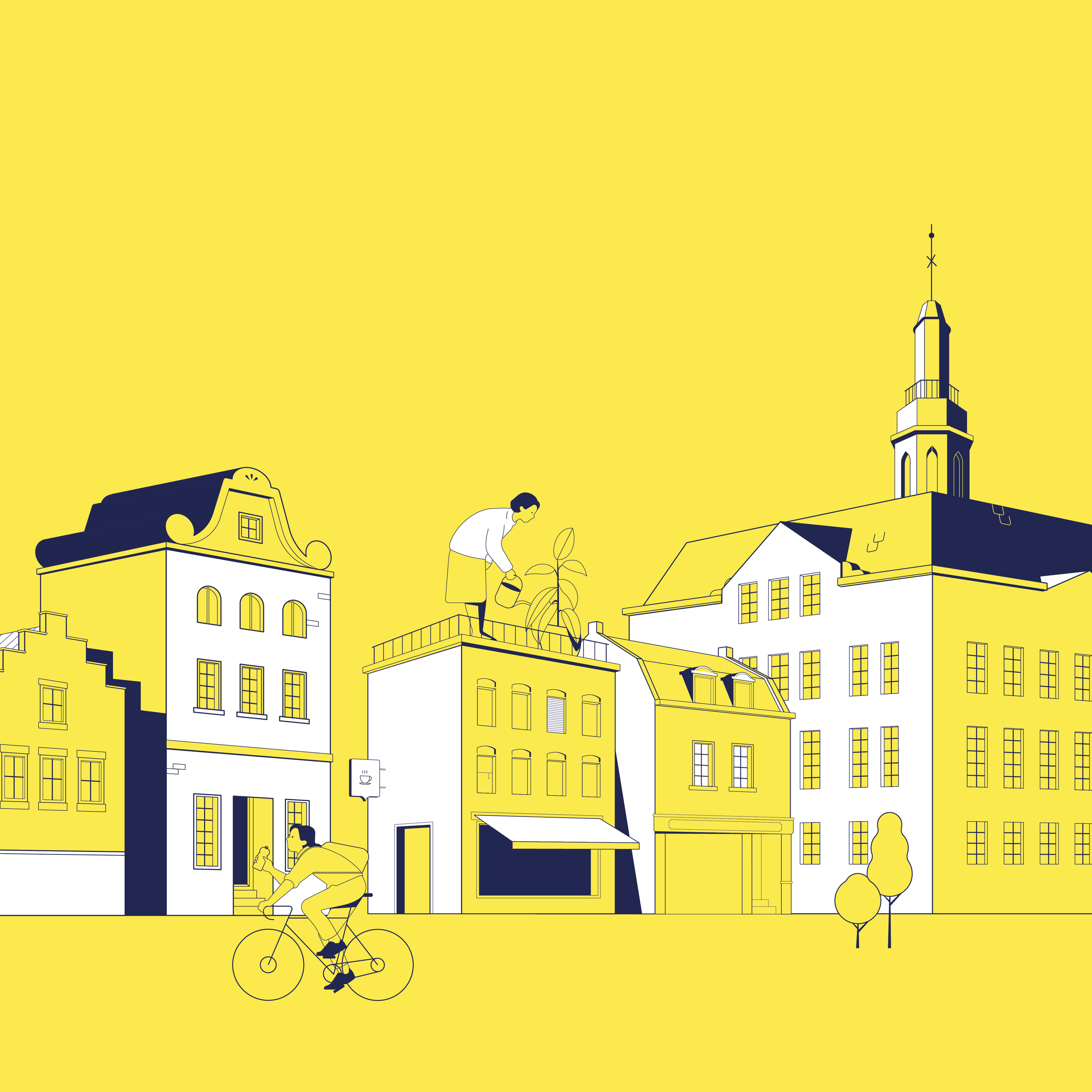 Illustrated infographic with landmarks and elements of Dutch and European cities.